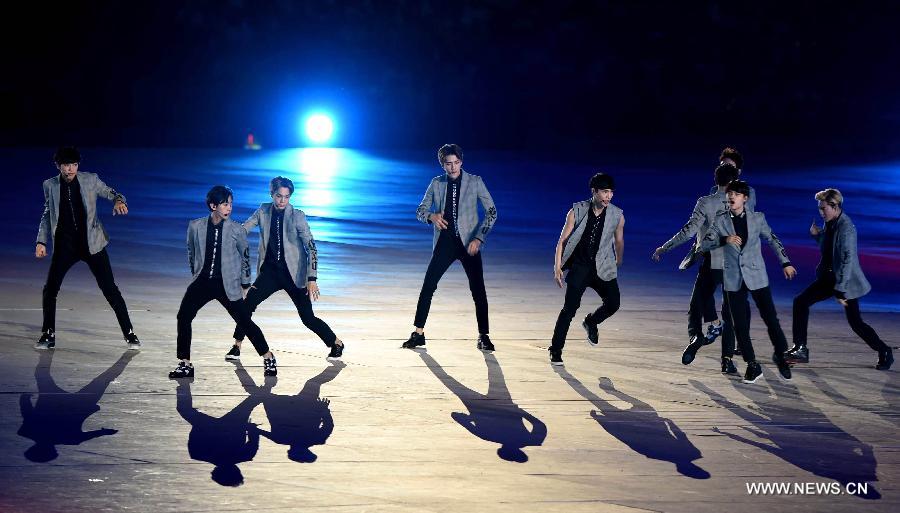 South Korean pop group EXO performs before the opening ceremony of the 17th Asian Games at the Incheon Asiad Main Stadium in Incheon, South Korea, Sept. 19, 2014. (Xinhua/Lin Yiguang)
