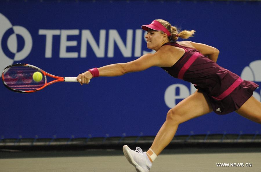 Angelique Kerber of Germany hits a return to Dominika Cibulkova of Slovakia during the third round match at the Toray Pan Pacific Open tournament in Tokyo, Japan, Sept. 19, 2014. (Xinhua/Stringer)