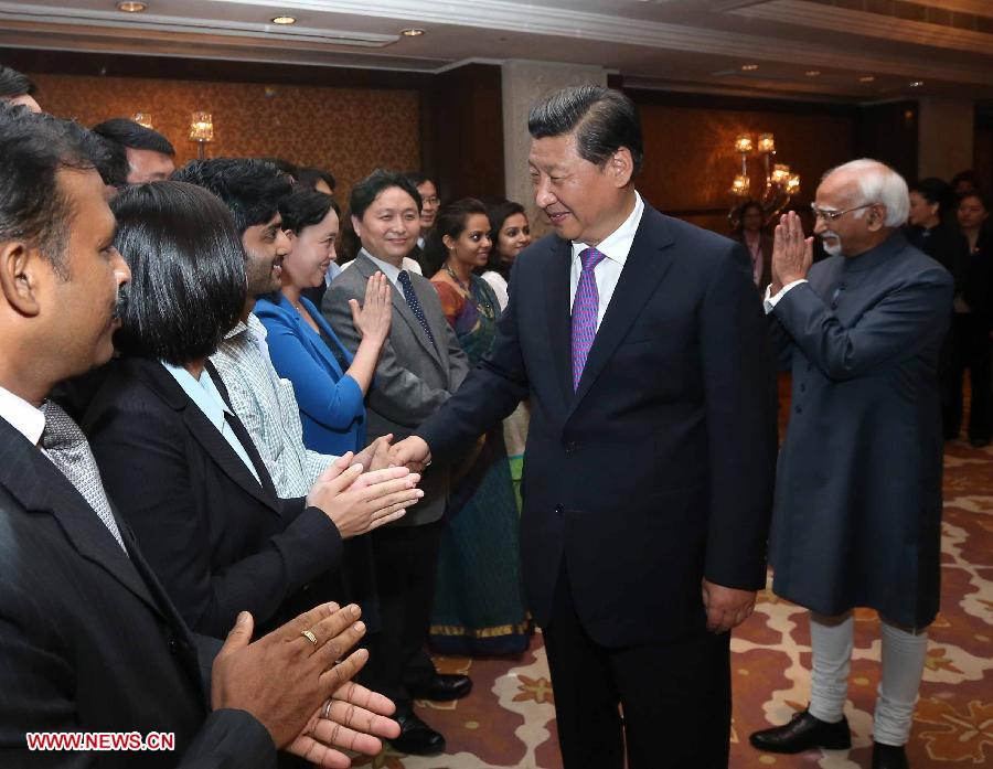 | Chinese President Xi Jinping meets with youths from China and India after delivering a speech at the Indian Council of World Affairs in New Delhi, India, Sept. 18, 2014. (Xinhua/Pang Xinglei) |