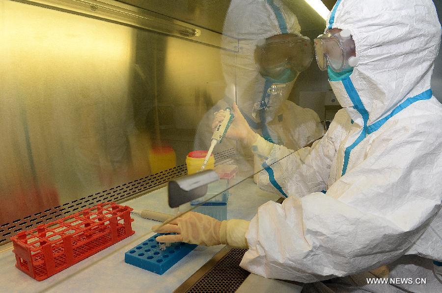 A researcher works in Chinese Center for Disease Control and Prevention (CDC) in Beijing, capital of China, Sept. 19, 2014. Chinese Center for Disease Control and Prevention announced on Friday that a diagnostic kit for ebolavirus was successfully developed and it would be soon applied in Sierra Leone. (Xinhua/He Junchang)