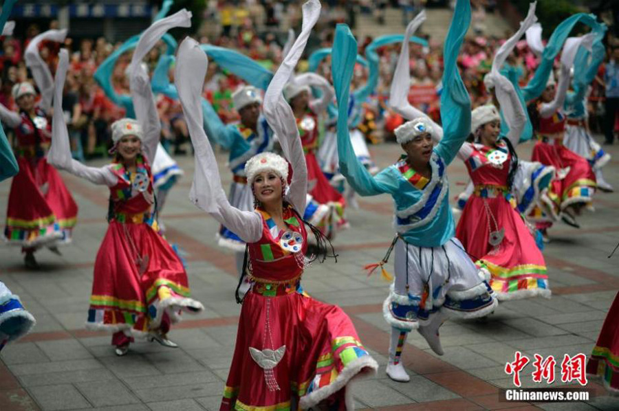 Shimmying, circling, belly waving, damas in ShapingBa, Chongqing, battle in a fierce dancing contest held by the local government, on September 16, 2014. The contest was specially designed for senior citizens and has successfully attracted 15 local square dance teams to participate in. With their excellent dancing skills and fancy props, the damas gave an absolute visual feast to the audience. (China News Agency/Yu You)