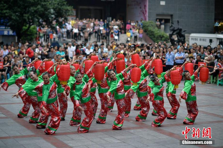 Shimmying, circling, belly waving, damas in ShapingBa, Chongqing, battle in a fierce dancing contest held by the local government, on September 16, 2014. The contest was specially designed for senior citizens and has successfully attracted 15 local square dance teams to participate in. With their excellent dancing skills and fancy props, the damas gave an absolute visual feast to the audience. (China News Agency/Yu You)
