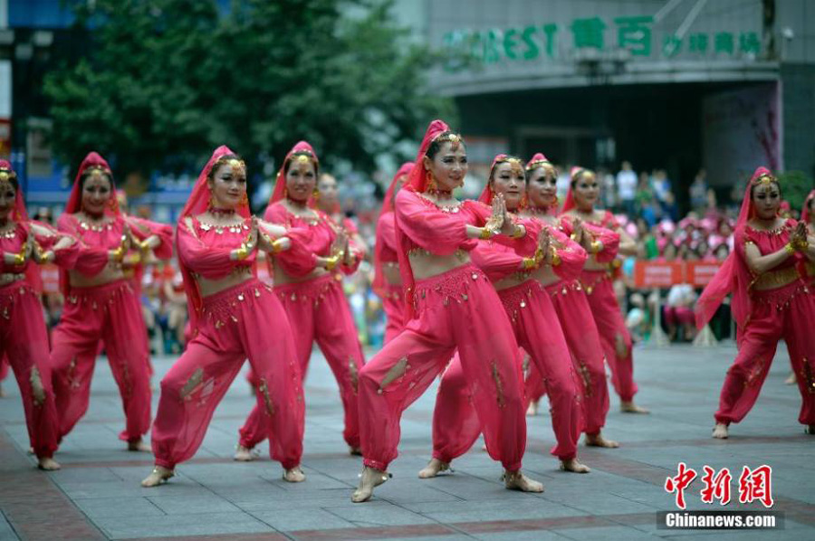 Shimmying, circling, belly waving, damas in ShapingBa, Chongqing, battle in a fierce dancing contest held by the local government, on September 16, 2014. The contest was specially designed for senior citizens and has successfully attracted 15 local square dance teams to participate in. With their excellent dancing skills and fancy props, the damas gave an absolute visual feast to the audience. (China News Agency/Yu You)