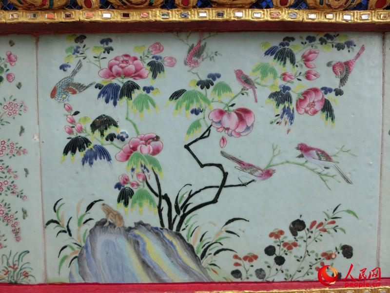 Chinese tiles painted with flowers and birds are adhered inside the Grand Palace. (People's Daily Online/Du Mingming)