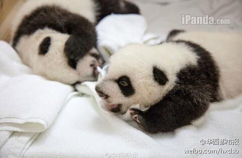 The first surviving panda triplets in the world open their eyes on Sept. 18, 2014. (Photo/Weibo)