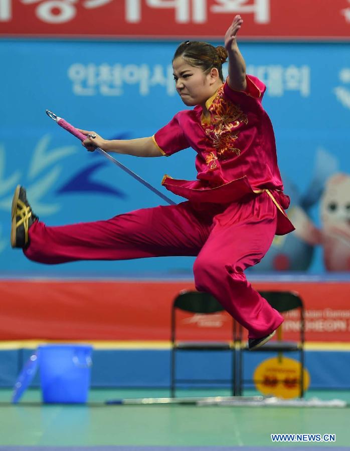 Tsai Wen Chuan of Chinese Taipei performs during the women's nandao of Wushu competition at the 17th Asian Games in Incheon, South Korea, Sept. 20, 2014. (Xinhua/Xie Haining)