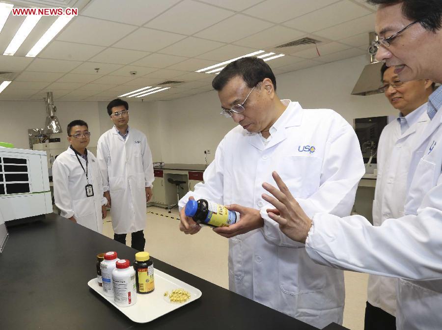 | Chinese Premier Li Keqiang (3rd L) visits the U.S. Pharmacopeial Convention (USP) in east China's Shanghai, Sept. 18, 2014. Li Keqiang made an inspection tour of China (Shanghai) Pilot Free Trade Zone from Sept. 18 to 19. (Xinhua/Ding Lin) |