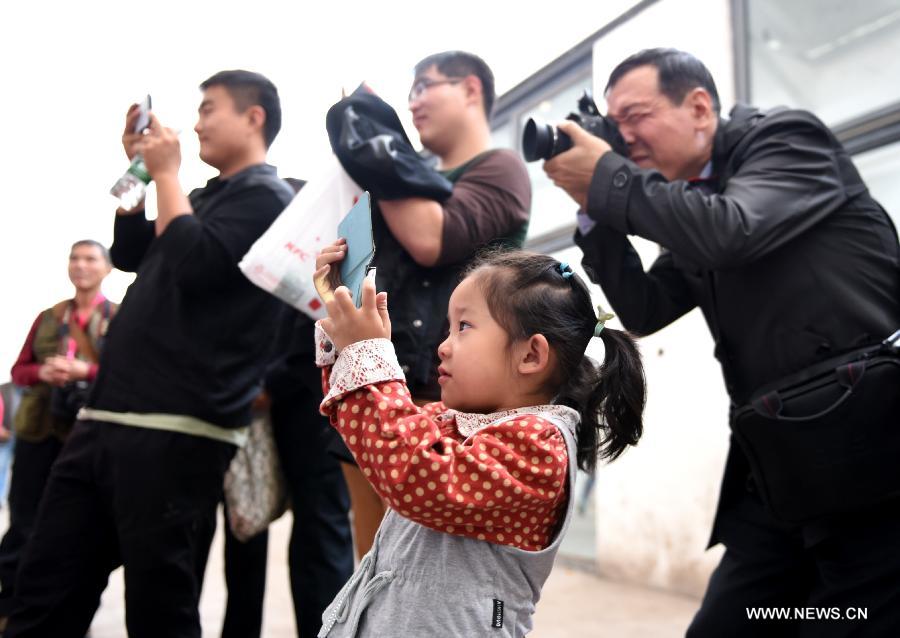A young girl takes photos with a mobile phone during the Pingyao International Photography Festival in Pingyao County, north China's Shanxi Province, Sept. 20, 2014. With the popularization of mobile phone cameras, mobile phone photography plays an important role in daily life. (Xinhua/Yan Yan)
