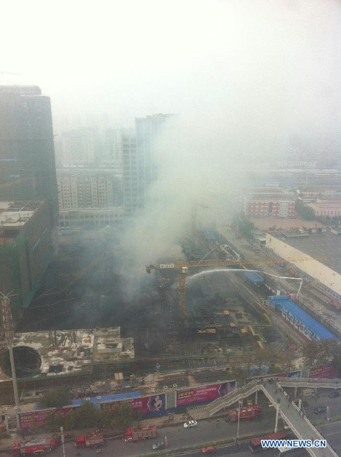 | Smoke is seen after a shopping mall under construction caught fire in Tianjin, north China, Sept. 21, 2014. (Xinhua/Yue Yuewei) |