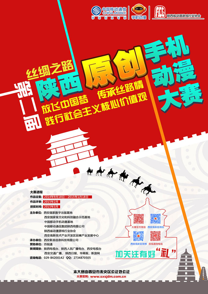 People can contribute works from September 18, 2014 to January 18, 2015. Art works should be created under the theme of the Silk Road culture and core socialist values and based on new media and mobile media presenting in the form of animation and cartoon to carry forward new healthy trends and uprightness. An online fee charging function will be enabled, as the contest specially cooperates with the China Mobile. And the earnings of this function, mainly through uploading and downloading art works, will be paid back to all contestants.