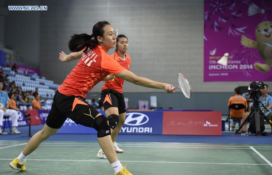 Zhao Yunlei (front) and Tian Qing of China compete against Takahashi Ayaka and Matsutomo Misaki of Japan during the women's badminton team semi-final match at the 17th Asian Games in Incheon, South Korea, Sept. 21, 2014. China won 3-1. (Xinhua/Ye Pingfan)