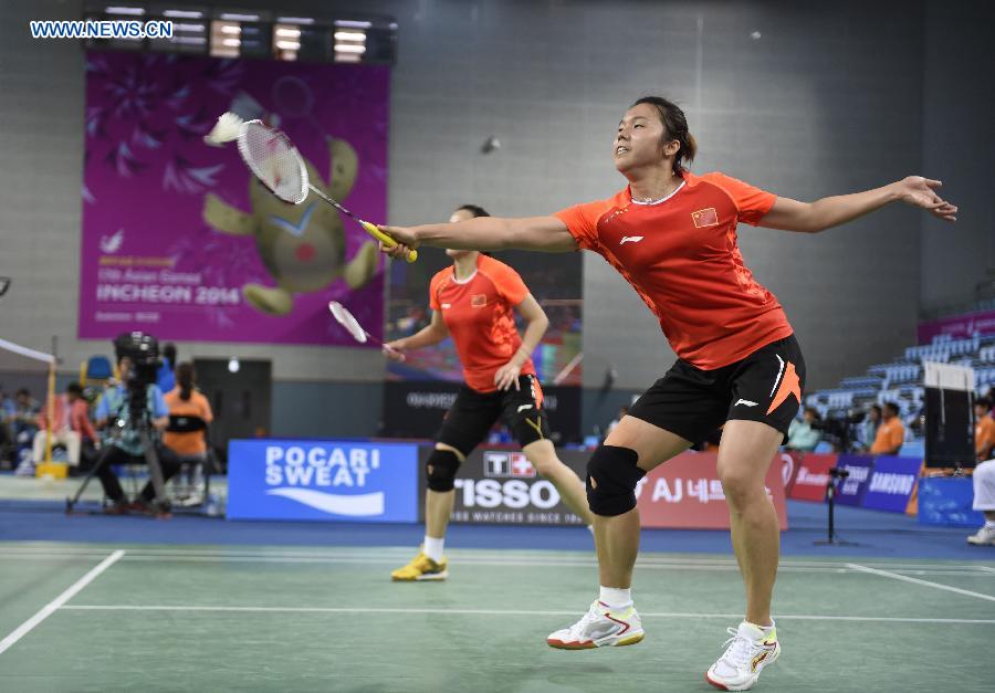 Zhao Yunlei and Tian Qing (front) of China compete against Takahashi Ayaka and Matsutomo Misaki of Japan during the women's badminton team semi-final match at the 17th Asian Games in Incheon, South Korea, Sept. 21, 2014. China won 3-1. (Xinhua/Ye Pingfan)