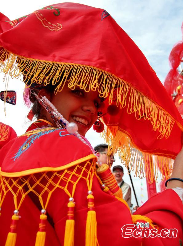 A traditional Chinese wedding ceremony for 20 foreign couples is held in Fengjing, an ancient water town of Shanghai on Sunday, September 21, 2014. Couples from 14 countries including India, Singapore, Afghanistan, Spain, and Poland tied the knot and experienced local ethnic customs at the event.