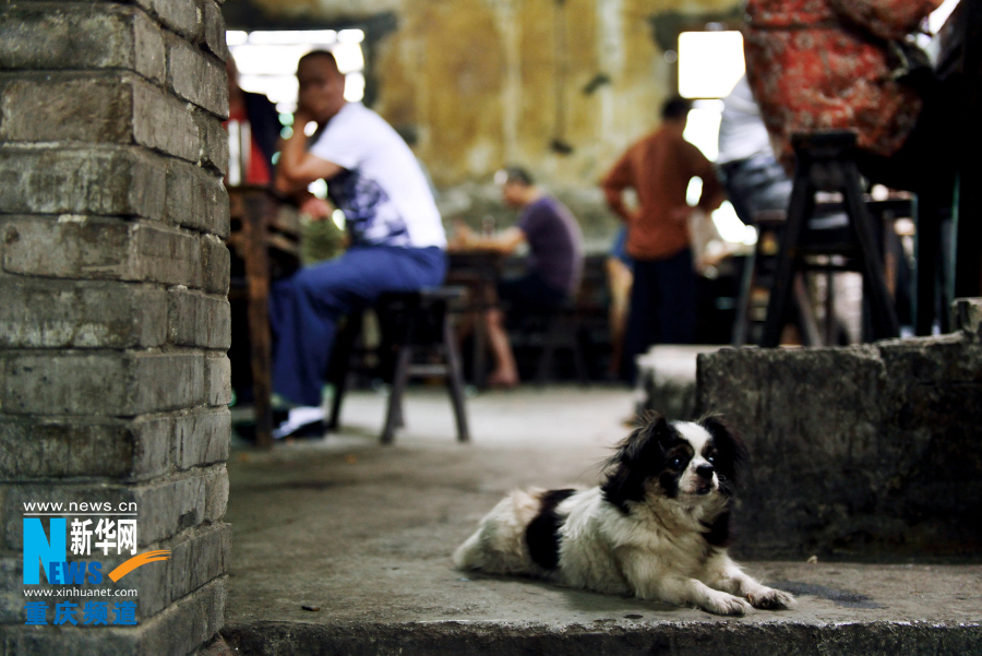 Tea drinkers always bring their pet dogs to the Transportation Teahouse, Aug. 13, 2014. (Xinhua News Agency/Li Xiangbo)