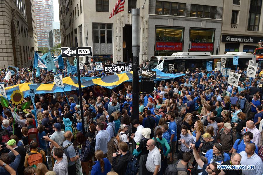 Protestors take part in the "flood Wall Street" demonstrations against climate change in New York, the United States, Spet. 22, 2014. (Xinhua/Yin Bogu)