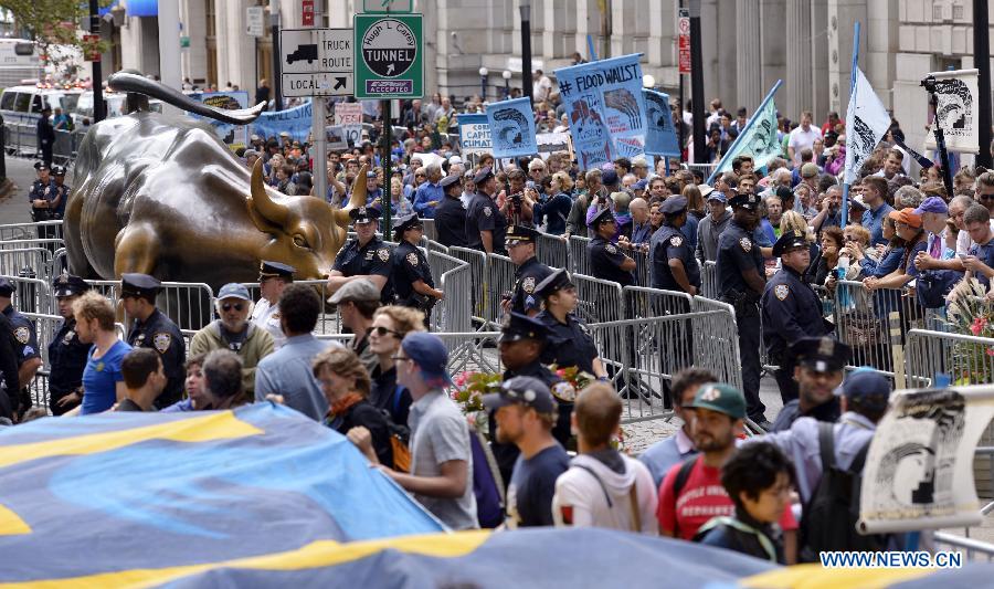 Protestors take part in the "flood Wall Street" demonstrations against climate change in New York, the United States, Spet. 22, 2014. (Xinhua/Yin Bogu)