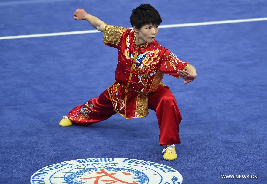 Geng Xiaoling of China's Hong Kong performs during the women's Changquan final of Wushu competition at the 17th Asian Games in Incheon, South Korea, Sept. 23, 2014. Geng Xiaoling won the silver medal. (Xinhua/Lin Yiguang)