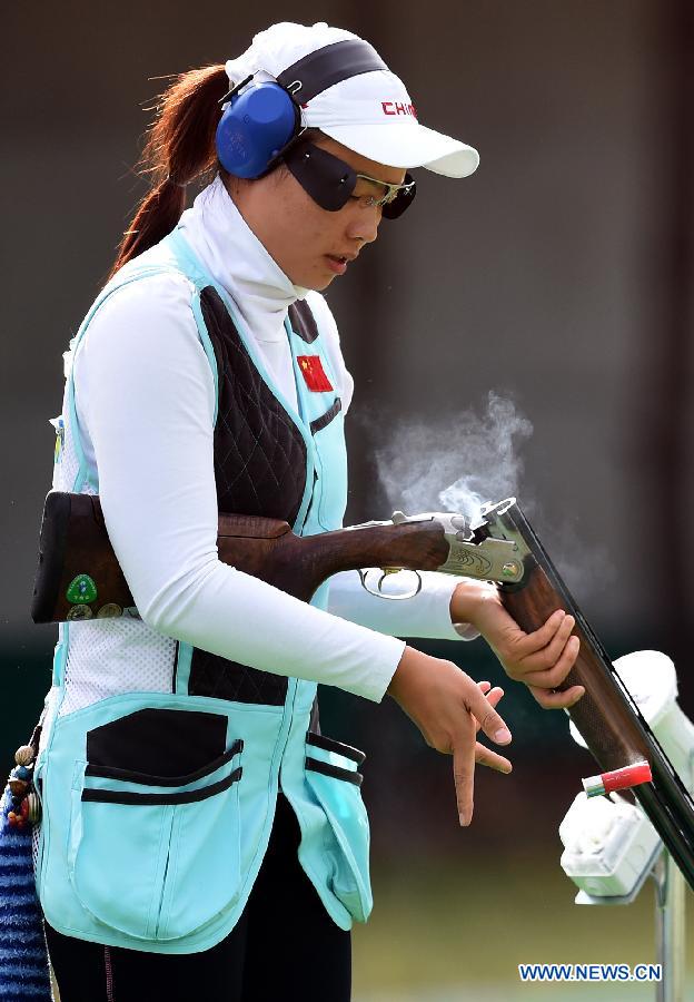 Zhu Jingyu of China competes during the trap women's gold medal match of shooting at the 17th Asian Games in Incheon, South Korea, Sept. 23, 2014. Zhu Jingyu defeated Nakayama Yukie of Japan and claimed the title. (Xinhua/Han Yuqing)