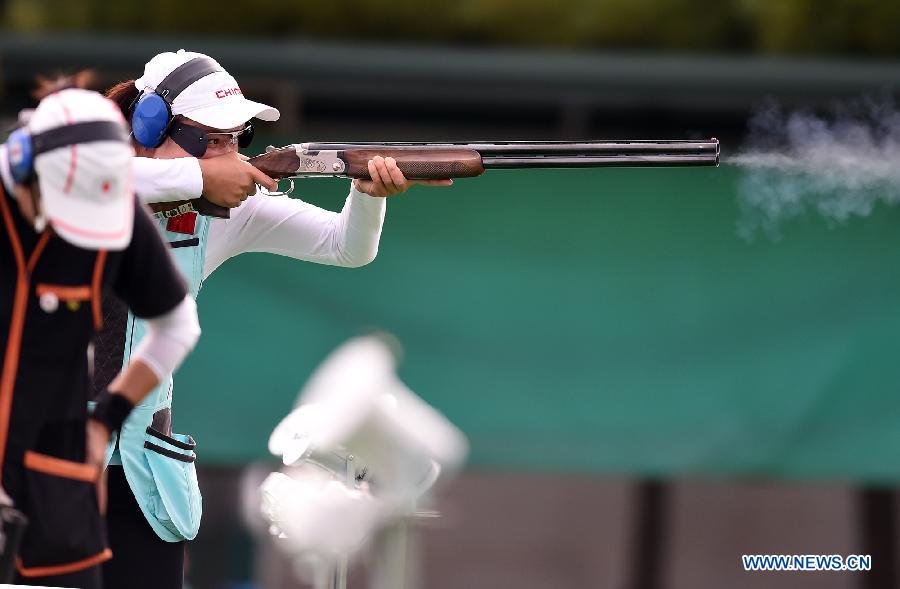 | Zhu Jingyu of China competes during the trap women's gold medal match of shooting at the 17th Asian Games in Incheon, South Korea, Sept. 23, 2014. Zhu Jingyu defeated Nakayama Yukie of Japan and claimed the title. (Xinhua/Han Yuqing) |