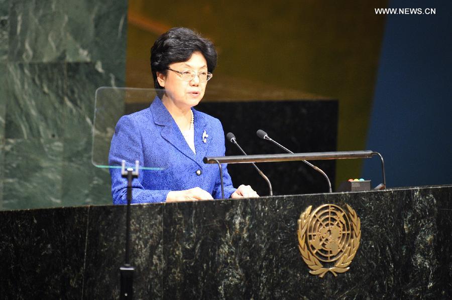 | Li Bin, minister in charge of the National Health and Family Planning Commission of China, speaks during a special session of the UN General Assembly on the follow-up to the Program of Action of the International Conference on Population and Development, at the UN headquarters in New York, on Sept. 22, 2014. (Xinhua/Niu Xiaolei) |