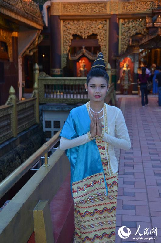 A woman welcomes tourists outside Karaweik Palace. (People's Daily Online/ Alvaro Lago Sanchez)