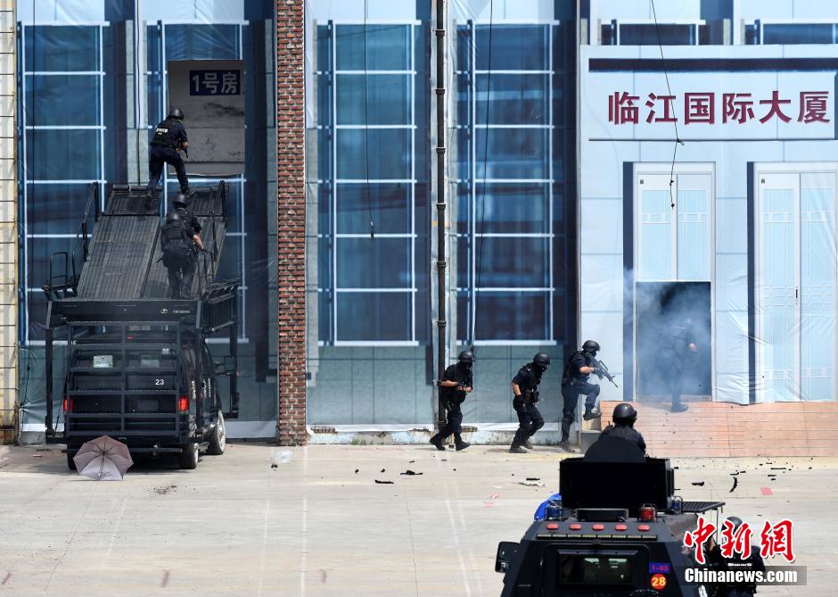 Guangdong police conduct 2014 anti-terrorism exercise in Guangzhou, capital city of south China’s Guangdong province on Sept. 20, 2014. The exercise was based on a real case. 1,825 policeman and soldiers took part in the anti-terrorism maneuvers such as assaulting, using patrol dogs to fight terrorism, shooting, rescuing hostage, etc. (Photo/Chinanews.com)