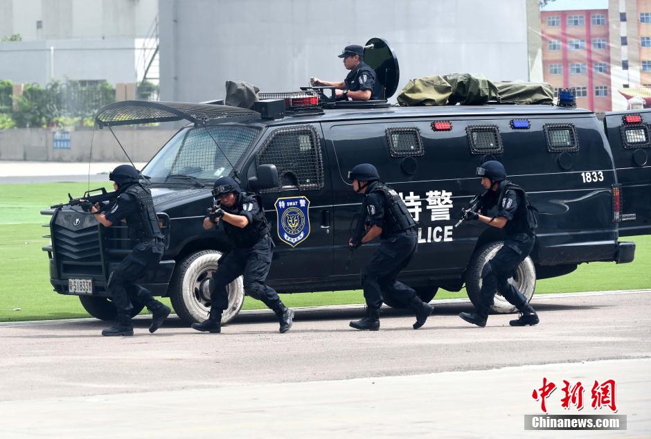 Guangdong police conduct 2014 anti-terrorism exercise in Guangzhou, capital city of south China’s Guangdong province on Sept. 20, 2014. The exercise was based on a real case. 1,825 policeman and soldiers took part in the anti-terrorism maneuvers such as assaulting, using patrol dogs to fight terrorism, shooting, rescuing hostage, etc. (Photo/Chinanews.com)