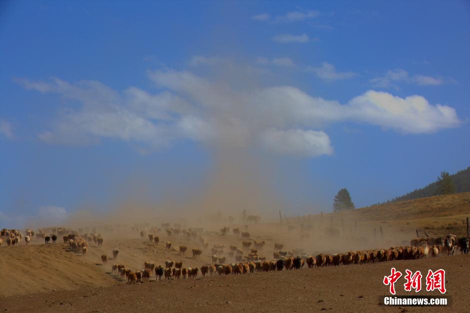 The nomads in Altay prefecture, northwest China's Xinjiang Uygur autonomous region, migrated to winter pasture with hundreds of thousands of cattle and sheep every September.(Chinanews.com/Liu Shihe)