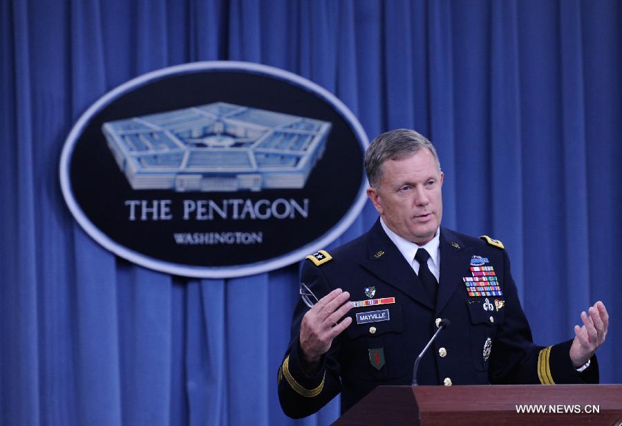 US Lieutenant General William Mayville briefs the press during a briefing at the Pentagon in Washington D.C., capital of the United States, Sept. 23, 2014. The airstrikes on the Islamic State (IS) targets in Syria overnight Monday were "only the beginning" of a coalition effort of the Unites States and its Arabic allies in the anti-IS fight, a Pentagon spokesman said Tuesday. Meanwhile, U.S. Lieutenant General William Mayville detailed the airstrikes, saying that the initial attack came in three waves. The first was launched from sea by cruise missiles followed by waves of U.S. and Arab bombers and fighters. (Xinhua/Bao Dandan)