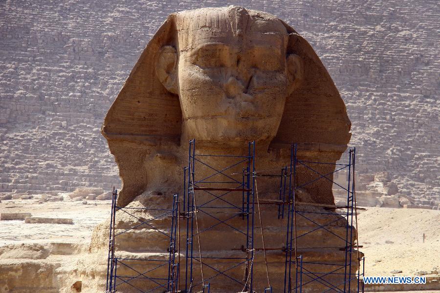 The Great Sphinx undergoes a large restoration process to repair the statue and its worn out base in Cairo, Egypt, on Sept. 21, 2014. (Xinhua/Ahmed Gomaa)