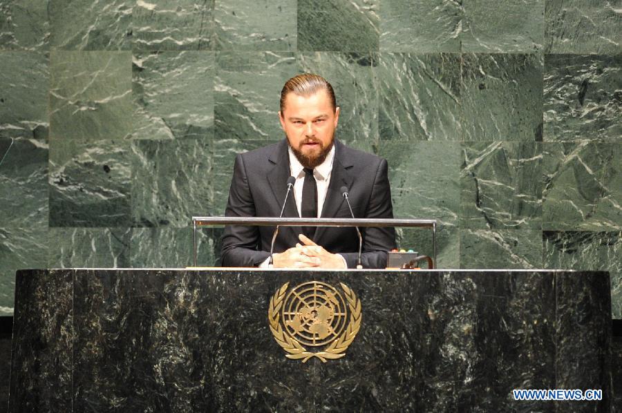 Leonardo DiCaprio, actor and UN Messenger of Peace, speaks during the opening ceremony of the Climate Summit at the UN headquarters in New York, on Sept. 23, 2014. The one-day summit, convened by UN Secretary-General Ban Ki-moon, is expected to galvanize global action on climate change. (Xinhua/Niu Xiaolei)