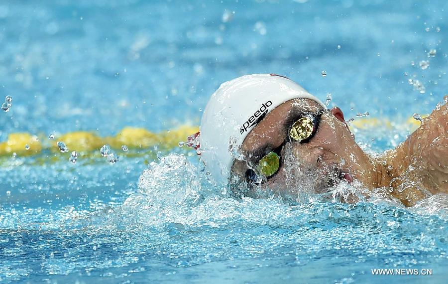 Huang Chaosheng of China swims during the preliminary match of men's 400m individual medley swimming at the 17th Asian Games in Incheon, South Korea, Sept. 24, 2014. Huang Chaosheng advanced to the final with 4 minutes and 19.13 seconds. (Xinhua/Gong Lei)
