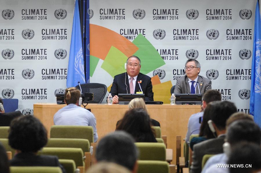 Xie Zhenhua(C), deputy director of China's National Development and Reform Commission, speaks during a press conference at the UN headquarters in New York, on Sept. 23, 2014. China pins high hopes on a new global climate change pact to be reached late next year, said Xie Zhenhua here Tuesday. (Xinhua/Niu Xiaolei)