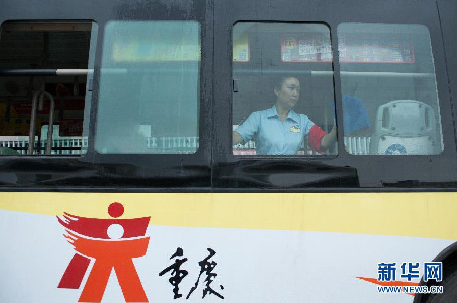 Li Mei wipes the windows of the bus to make sure passengers have a clean environment. (Photo/Xinhuanet)