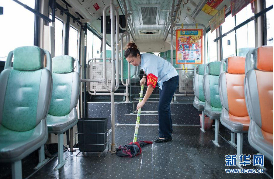 Li Mei cleans the bus. At work, she is also very responsible for her work. (Photo/Xinhuanet)