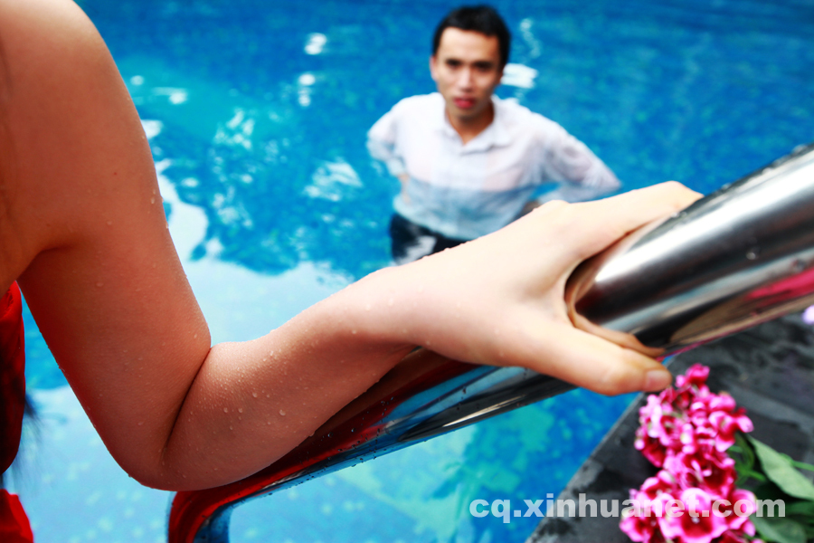 A new couple tries the temperature of the water in the swimming pool in Nanan District, Chongqing, on Sept. 1, 2014. Because of the sudden temperature drop, water temperature in the swimming pool was below 20 degrees Centigrade. (Xinhua News Agency/Pengbo)