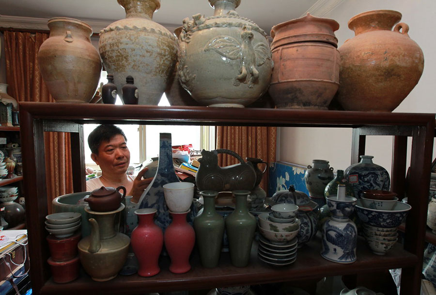 Hu Ping checks the ancient ceramic at home. (CNS/Xinhua)