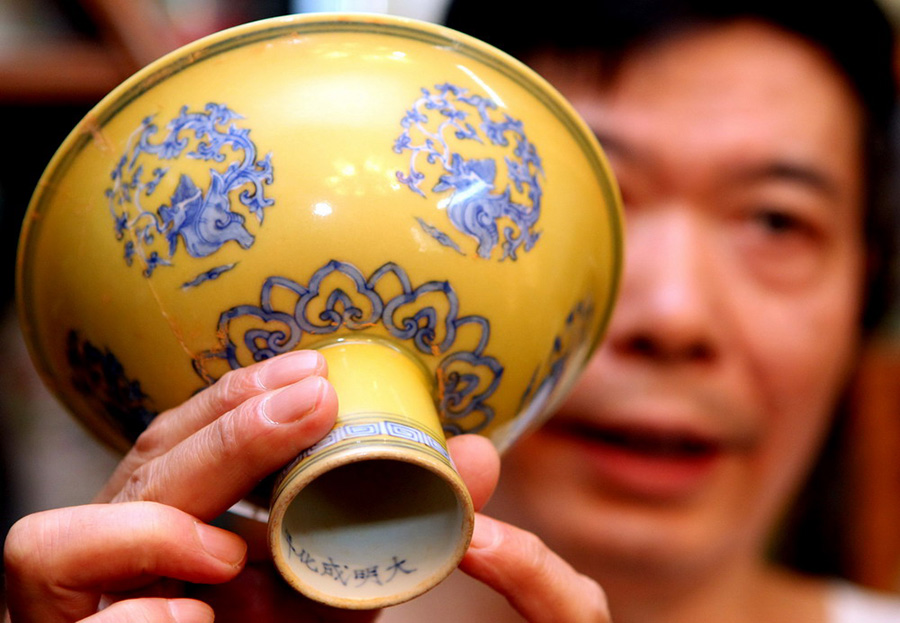Hu Ping introduces the craftsmanship of imperial porcelains. (CNS/Xinhua)