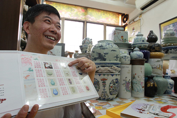 Hu Ping presents his album of art stamps. (CNS/Xinhua)