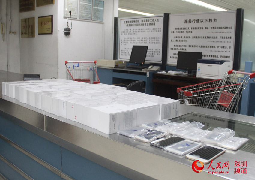 iPhone 6 smartphones seized by Shenzhen Customs are displayed on Sept. 22, 2014. Shenzhen Customs officers first seized three SLR camera lens in a man’s backpack, then eight new iPhone6 smartphones in three underpants he wore, worth about 40,000 yuan. Recently, more than 2,000 iPhone 6 smartphones have been confiscated since they hit shelves in Hong Kong last Friday. Some smugglers admitted to attempting to smuggle the new Smartphone onto the mainland, where they are still not legally available. (Photo: Shenzhen Customs)