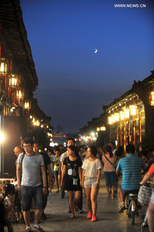Tourists visit Pingyao Ancient Town, Pingyao County, north China's Shanxi Province, July 30, 2014. Located in Jinzhong Basin of Shanxi Province, the 2700-year-old Pingyao Ancient Town is one of the most well-preserved ancient towns in China. Pingyao, which was added to the World Heritage List by UNESCO in 1997, attracts numerous tourists from all over the world. (Xinhua/Yan Yan)