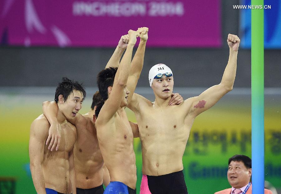 Chinese athlete Sun Yang (1st R) and his teammate Yu Hexin, Lin Yongqing and Ning Zetao celebrate after winning the men's 4×100m freestyle relay final of swimming event at the 17th Asian Games in Incheon, South Korea, Sept. 24, 2014. China won the gold medal with 3 minutes and 13.47 seconds. (Xinhua/Wang Peng)