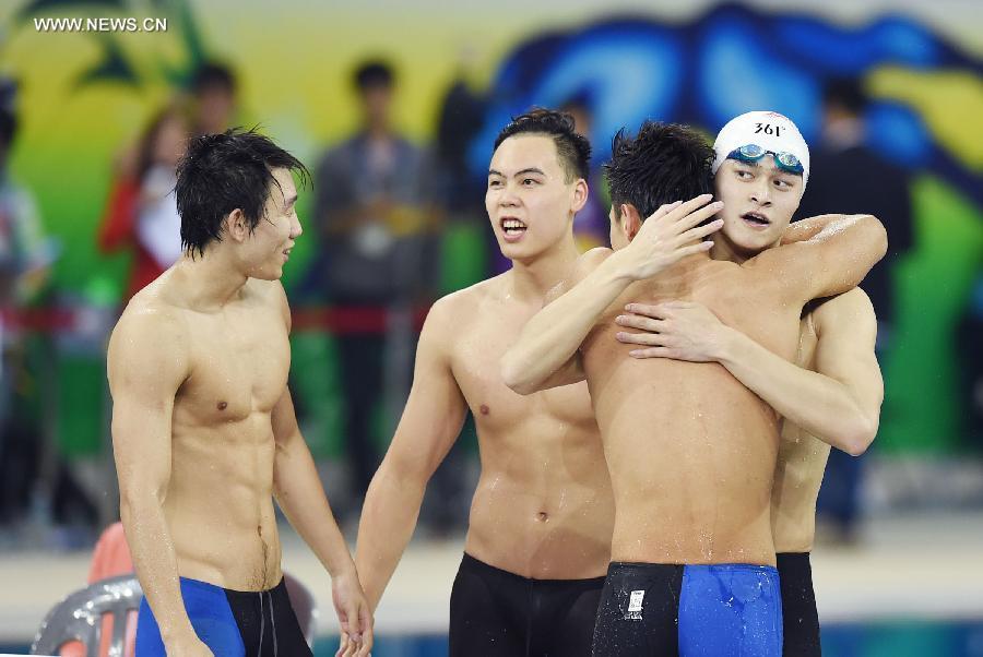 Chinese swimmers Sun Yang, Ning Zetao, Yu Hexin and Lin Yongqing (from R to L) celebrate after winning the men's 4×100m freestyle relay final of swimming event at the 17th Asian Games in Incheon, South Korea, Sept. 24, 2014. China won the gold medal with 3 minutes and 13.47 seconds. (Xinhua/Gong Lei)
