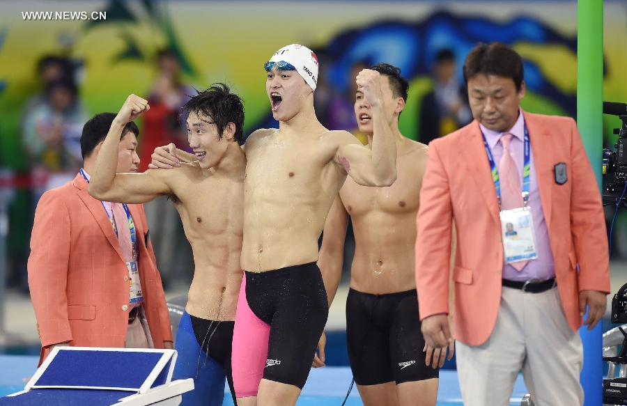 Chinese swimmer Sun Yang (C) celebrates with his teammates Lin Yongqing (2nd L) and Yu Hexin (2nd R) after winning the men's 4×100m freestyle relay final of swimming event at the 17th Asian Games in Incheon, South Korea, Sept. 24, 2014. China won the gold medal with 3 minutes and 13.47 seconds. (Xinhua/Gong Lei)