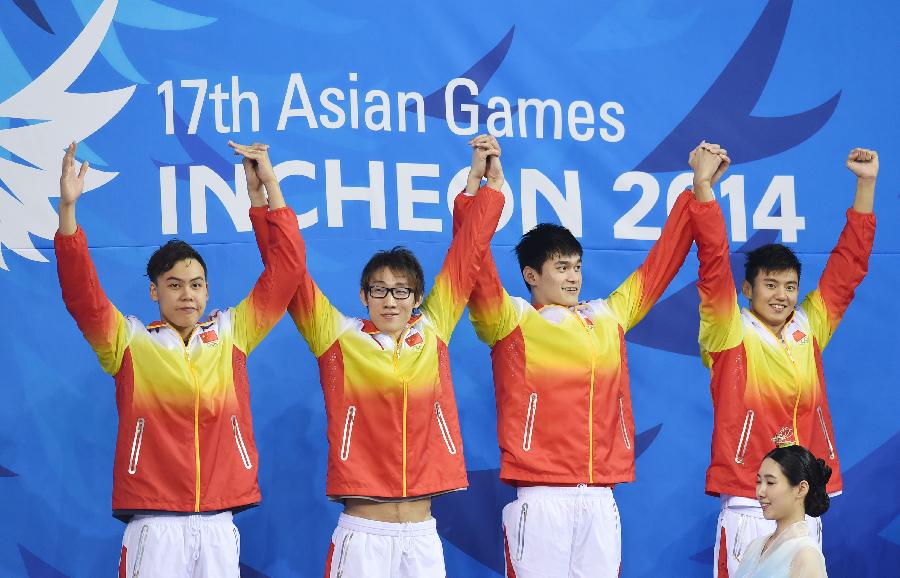 Chinese swimmers Ning Zetao, Sun Yang, Lin Yongqing and Yu Hexin (from R to L) pose on the podium during the awarding ceremony of the men's 4×100m freestyle relay contest of swimming event at the 17th Asian Games in Incheon, South Korea, Sept. 24, 2014. China won the gold medal with 3 minutes and 13.47 seconds. (Xinhua/Gong Lei)