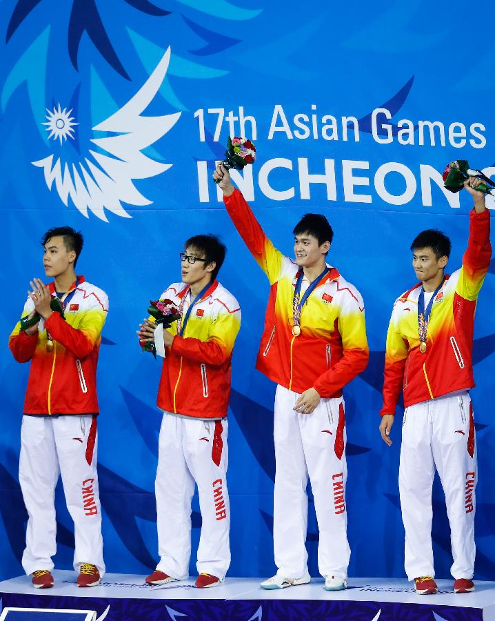 Chinese swimmers Ning Zetao, Sun Yang, Lin Yongqing and Yu Hexin (from R to L) pose on the podium during the awarding ceremony of the men's 4×100m freestyle relay contest of swimming event at the 17th Asian Games in Incheon, South Korea, Sept. 24, 2014. China won the gold medal with 3 minutes and 13.47 seconds. (Xinhua/Gong Lei)