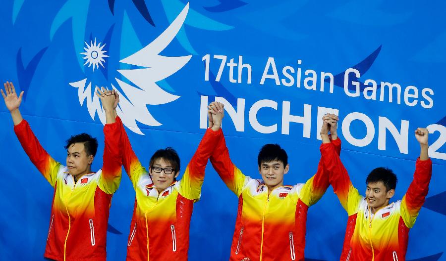 Chinese swimmers Ning Zetao, Sun Yang, Lin Yongqing and Yu Hexin (from R to L) pose on the podium during the awarding ceremony of the men's 4×100m freestyle relay contest of swimming event at the 17th Asian Games in Incheon, South Korea, Sept. 24, 2014. China won the gold medal with 3 minutes and 13.47 seconds. (Xinhua/Zhang Fan)