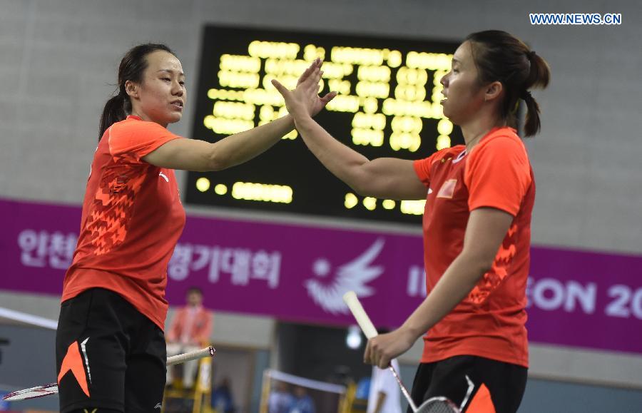 | Tian Qing (R) and Zhao Yunlei of China celebrate during the women's doubles quarterfinal match of badminton against Kim Hana and Jung Kyungeun of South Korea at the 17th Asian Games in Incheon, South Korea, Sept. 25, 2014. Tian Qing and Zhao Yunlei won 2-1. (Xinhua/Ye Pingfan) |