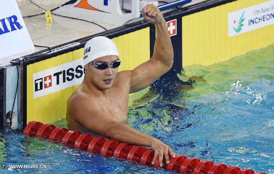 Shi Yang of China celebrates after the men's 50m butterfly final of swimming event at the 17th Asian Games in Incheon, South Korea, Sept. 25, 2014. Shi Yang won the gold medal with 23.46 seconds. (Xinhua/Lin Yiguang)