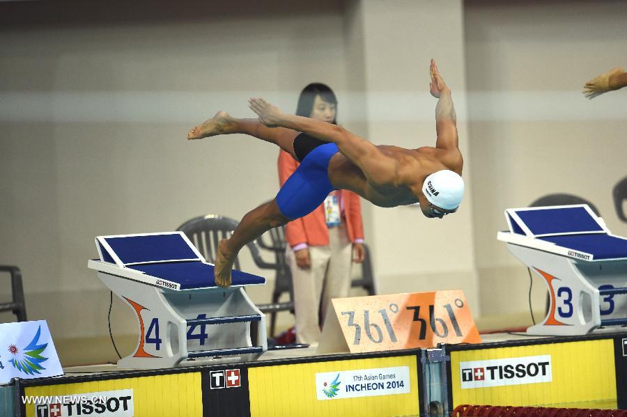 Shi Yang of China dives to water during the men's 50m butterfly final of swimming event at the 17th Asian Games in Incheon, South Korea, Sept. 25, 2014. Shi Yang won the gold medal with 23.46 seconds. (Xinhua/Han Yuqing)
